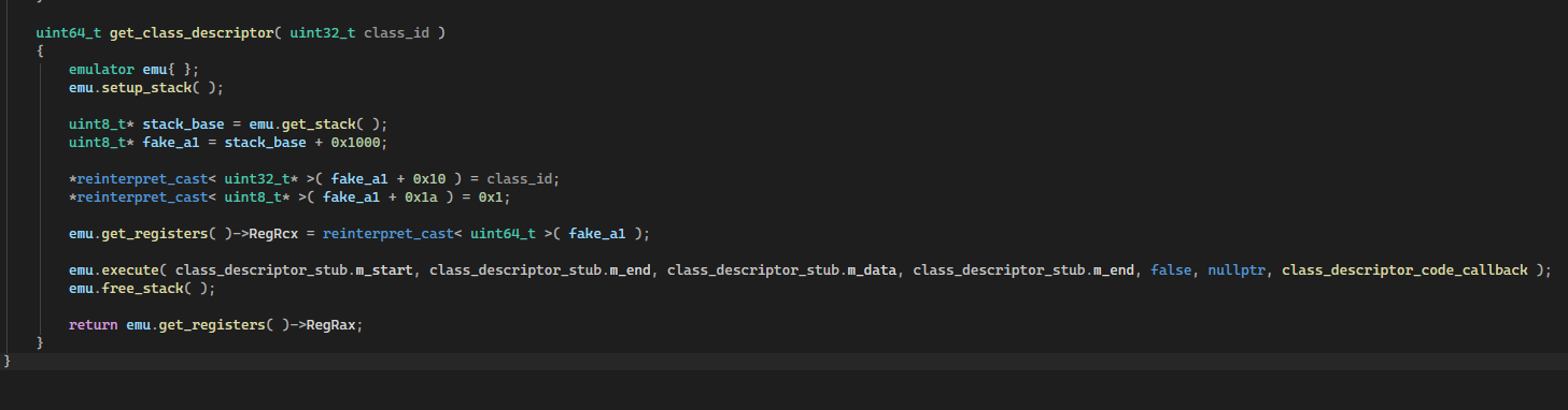 So, we could use pattern scanning (scanning for an array of bytes in target process), to get the start and end of the stub we want to emulate. The library I like to use is made by bitdefender. It's extremely light weight for what it does.